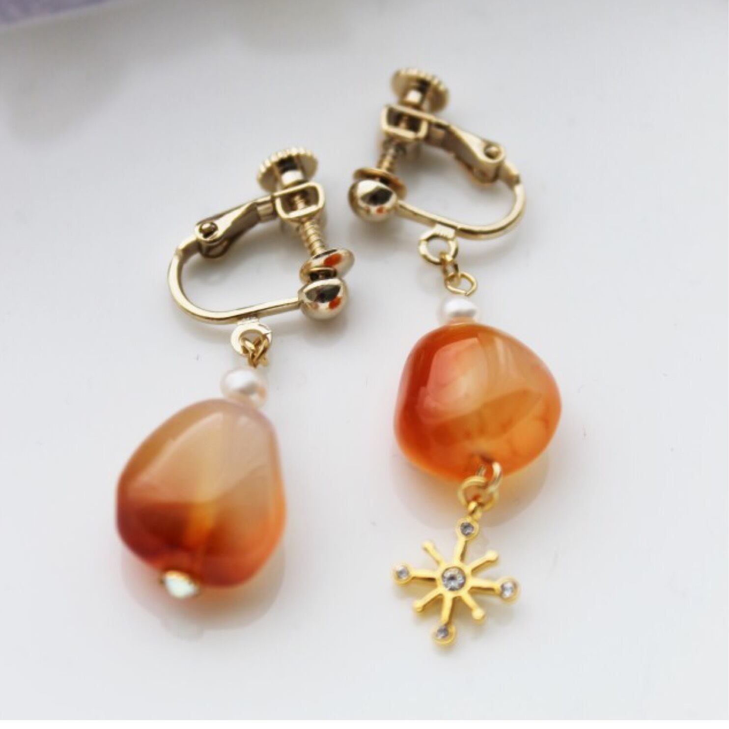 綺麗なお色のカーネリアンがあしらわれた大人可愛いデザインのイヤリングです。